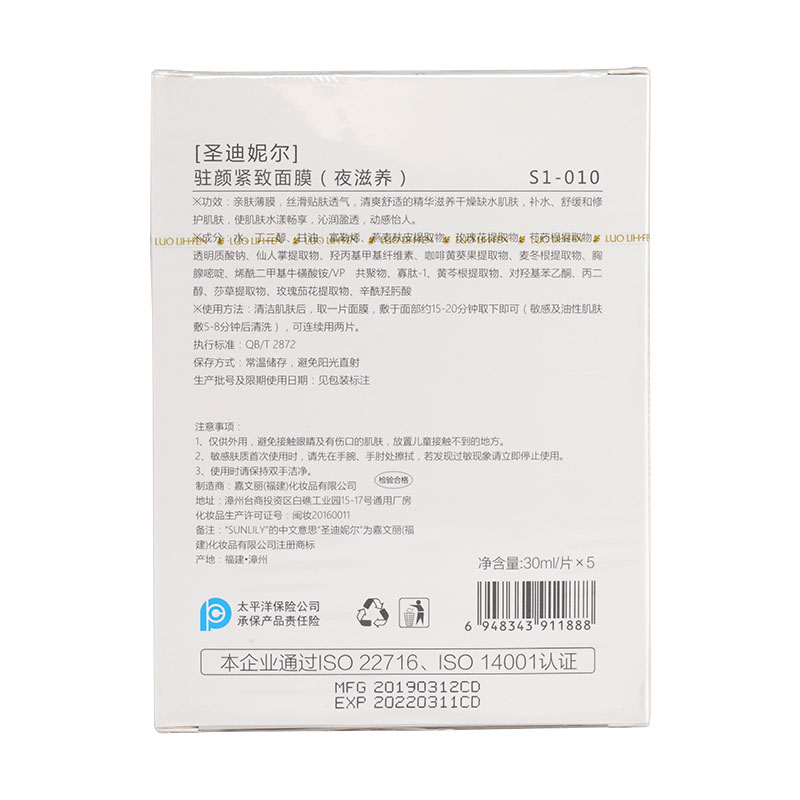 圣迪妮尔(SUNLILY)驻颜紧致面膜30ml×5片(夜滋养)含眼膜
