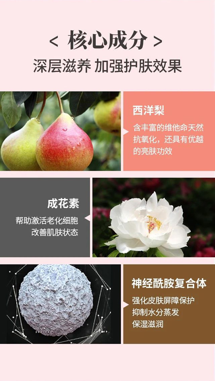 日本扁柏水,侧柏水,北美金缕梅花水,莲花水,西洋梨果提取物,卷丹花/叶/茎提取物,天然亲肤性,深层润泽,滋养,保湿肌肤。
