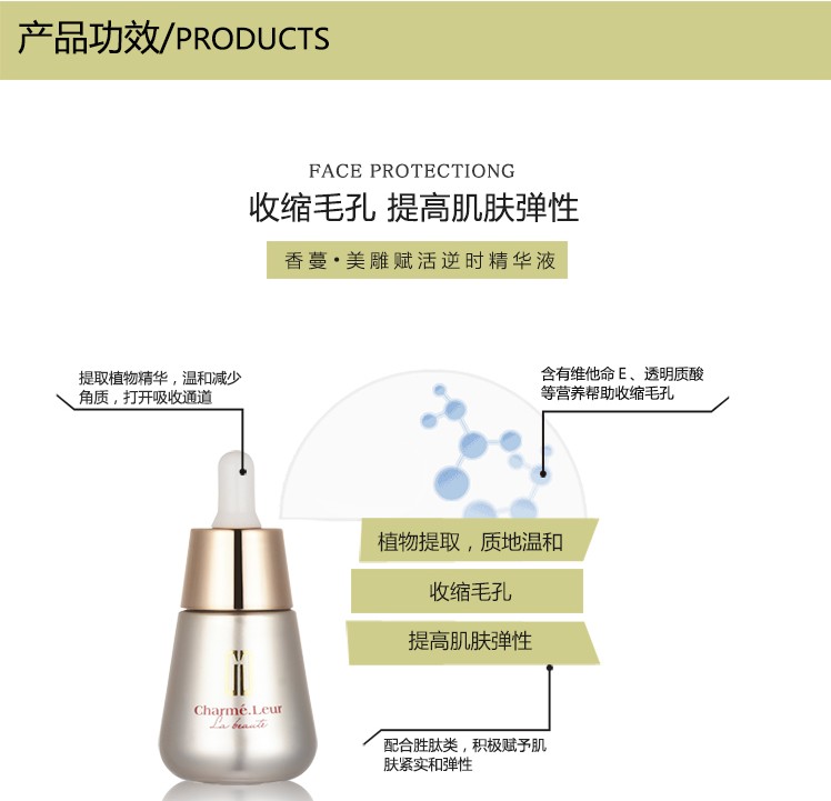 使用方法:洁肤后,取适量于面颈部,以指腹轻柔按摩至完全吸收。配合霜类一起使用,效果更佳,21天为一疗程。