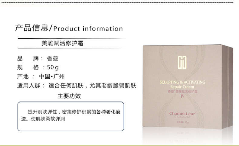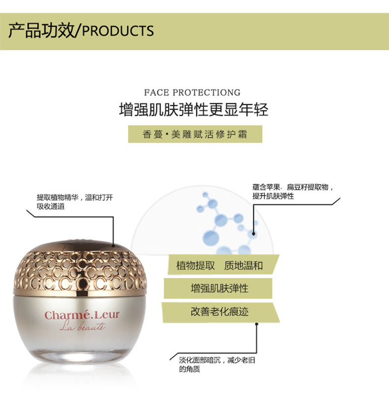 作用:独特的奢华绵密乳霜轻抚肌肤,富含金纽扣花,苹果,扁豆籽提取物,提升肌肤弹性,同时输送大量抗氧物质,密集修护日间累积各项老化痕迹,是肌肤柔软弹润紧致光彩宛若新生。