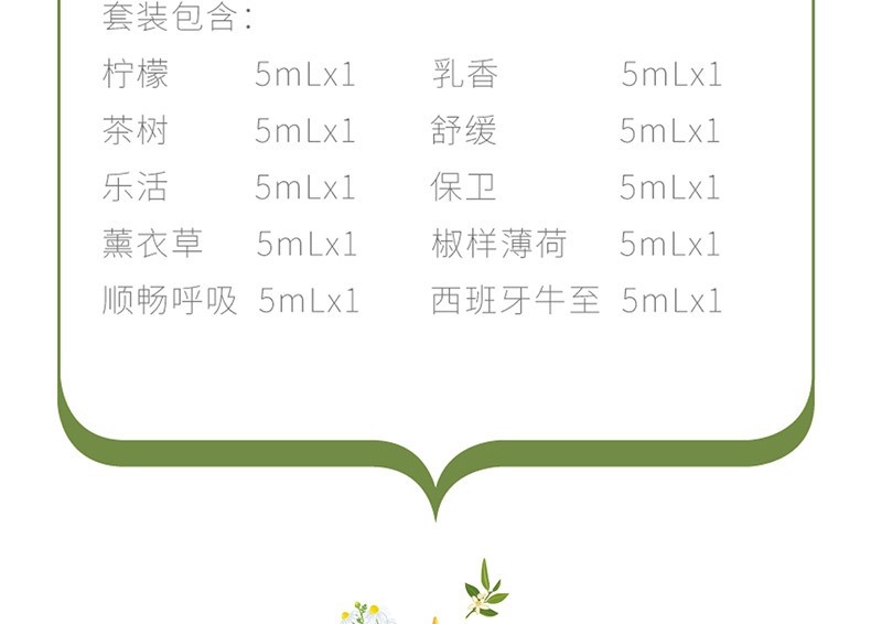产品成份:家庭精选套装包括: 薰衣草 柠檬 薄荷 茶树 牛至 舒缓复方 顺畅呼吸复方 乐活复方 保卫复方 乳香