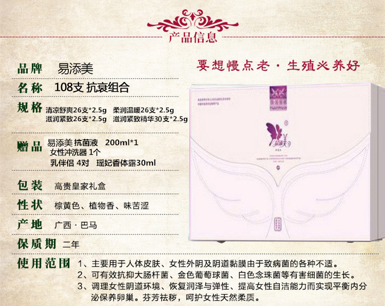 主要功效:有效调理女性阴道缓解、恢复润泽与弹性、提高女性自洁能力而实现平衡内分泌保养卵巢,呵护女性天然柔质。
