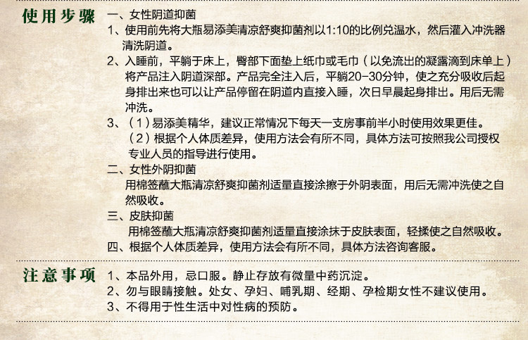 注意事项:孕妇、儿童及过敏体质者禁用。本品不能替代药品。月经期到月经干净3天禁用