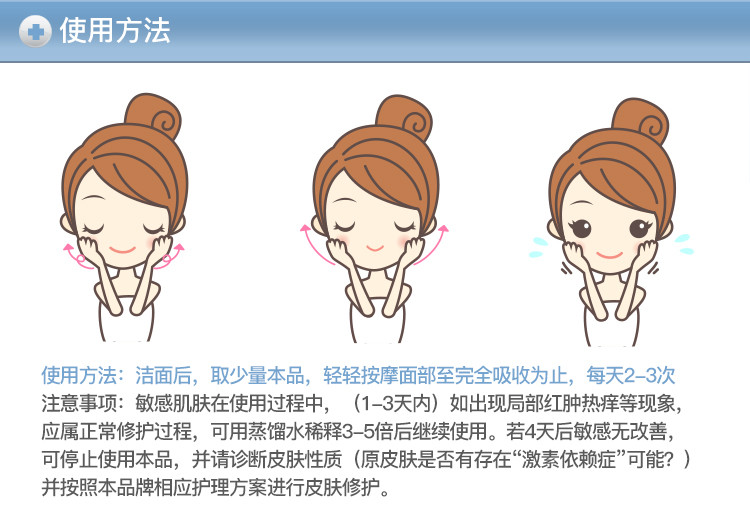 使用方法:洁面后,先用能量修护基础液均匀喷于面部,直至完全吸收,反复1-3次后,再取少许本品,轻轻按摩面部至完全吸收为止,每天2-3次。