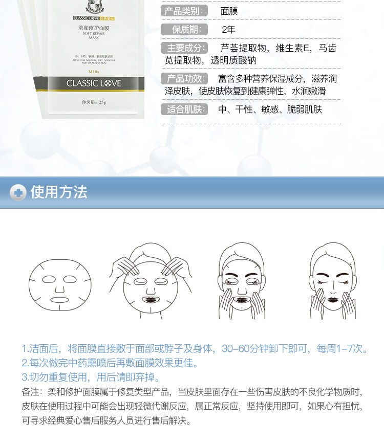 使用方法:面后,将面膜晨直接贴于面部,15-30分钟后取下后清洗即可