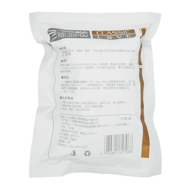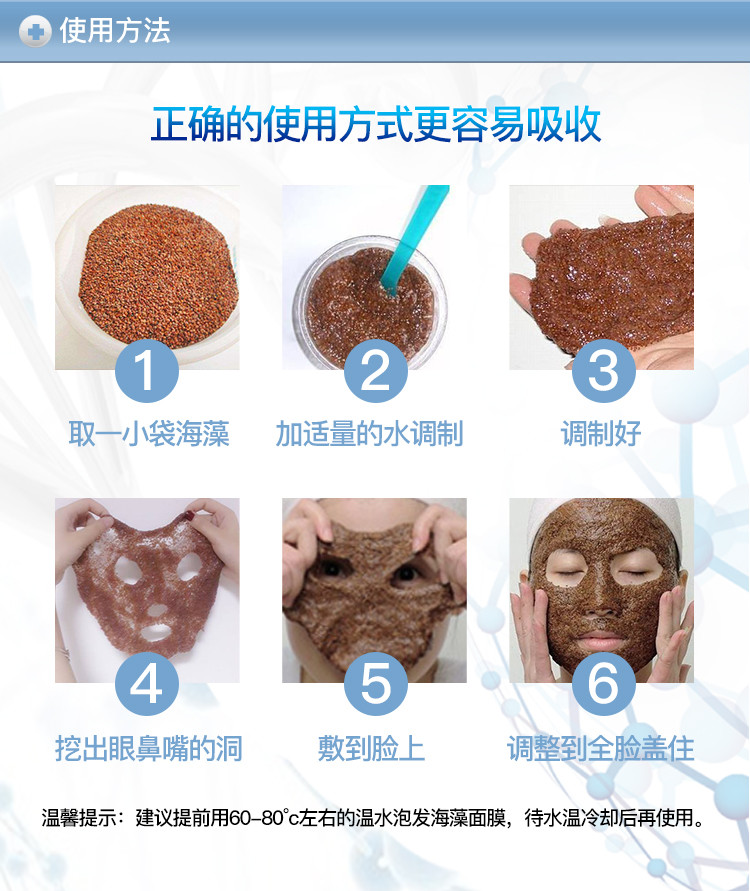 使用方法:将植物本草海藻面膜一小包倒入面膜等容器中,加入适量的清水(约80-90ml),轻轻搅拌均匀,待海藻充分吸收水分后,将面膜均匀敷在面部,时间为30-60分钟,然后轻轻取下面膜即可,每天1-2次。