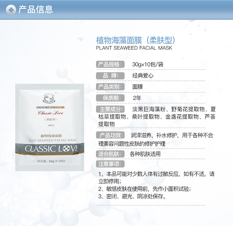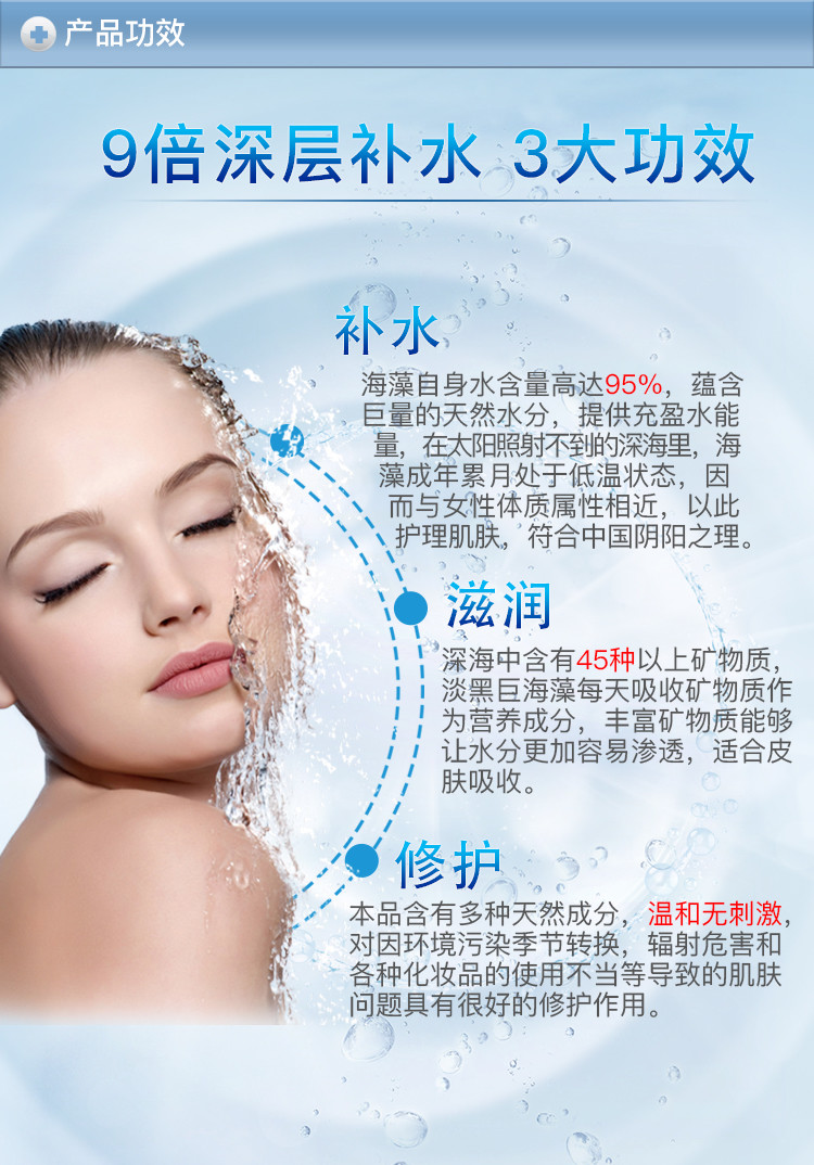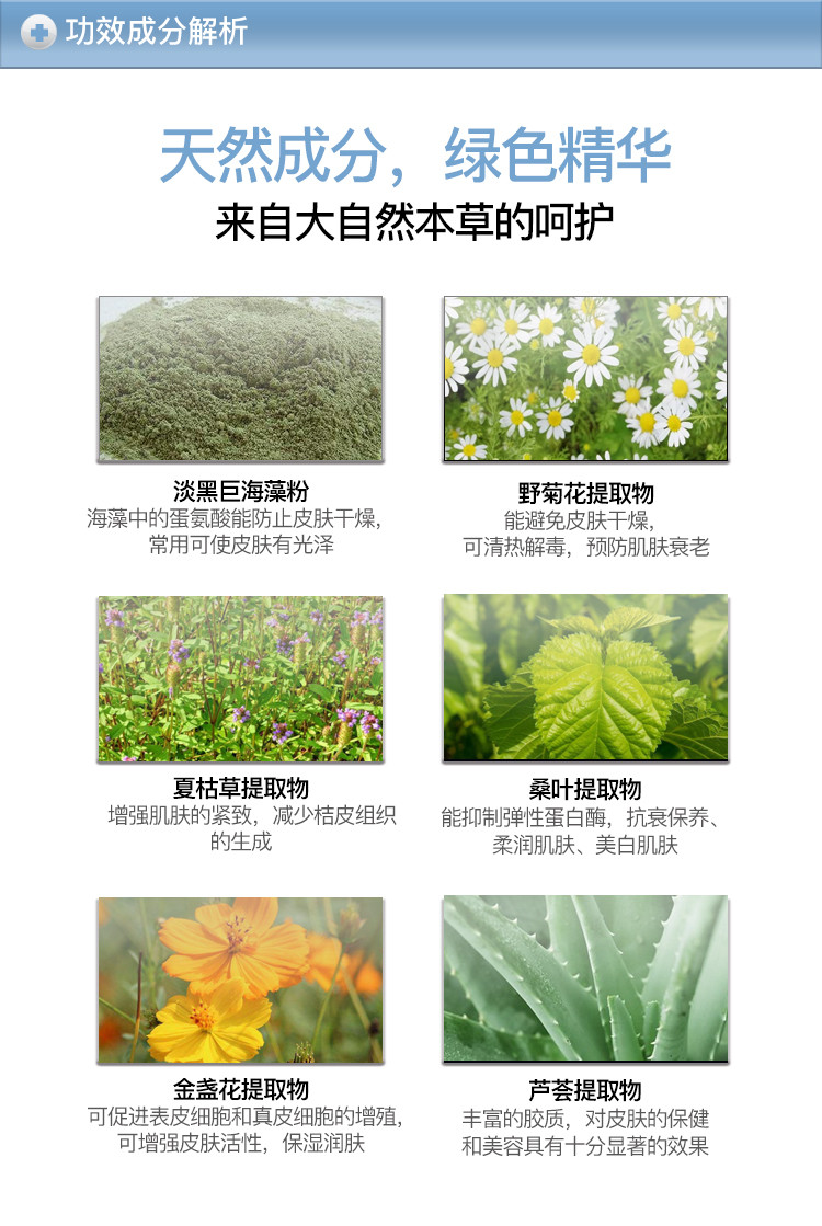 成份:海藻提取物、野菊花提取物、夏枯草提取物、库拉索芦荟叶粉、桑叶提取物、金盏花提取物