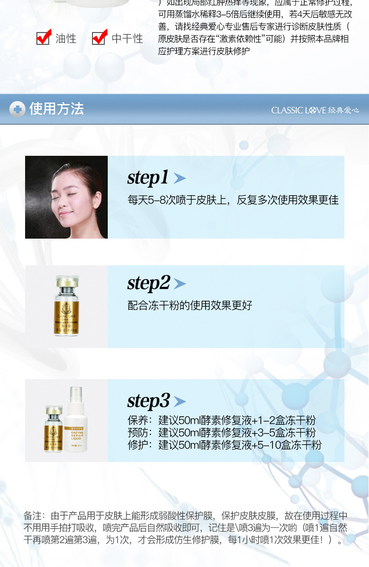 使用方法:直接喷于皮肤上,每天3—5次,轻拍至吸收,反复多次效果更佳;