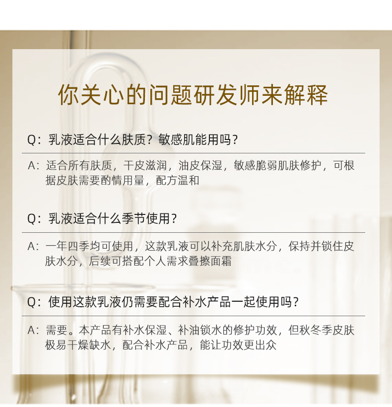 作用:温和补水配方,补充肌肤水分同时修护受损肌肤,滋养润泽,提亮肤色,用后皮肤细致润滑。