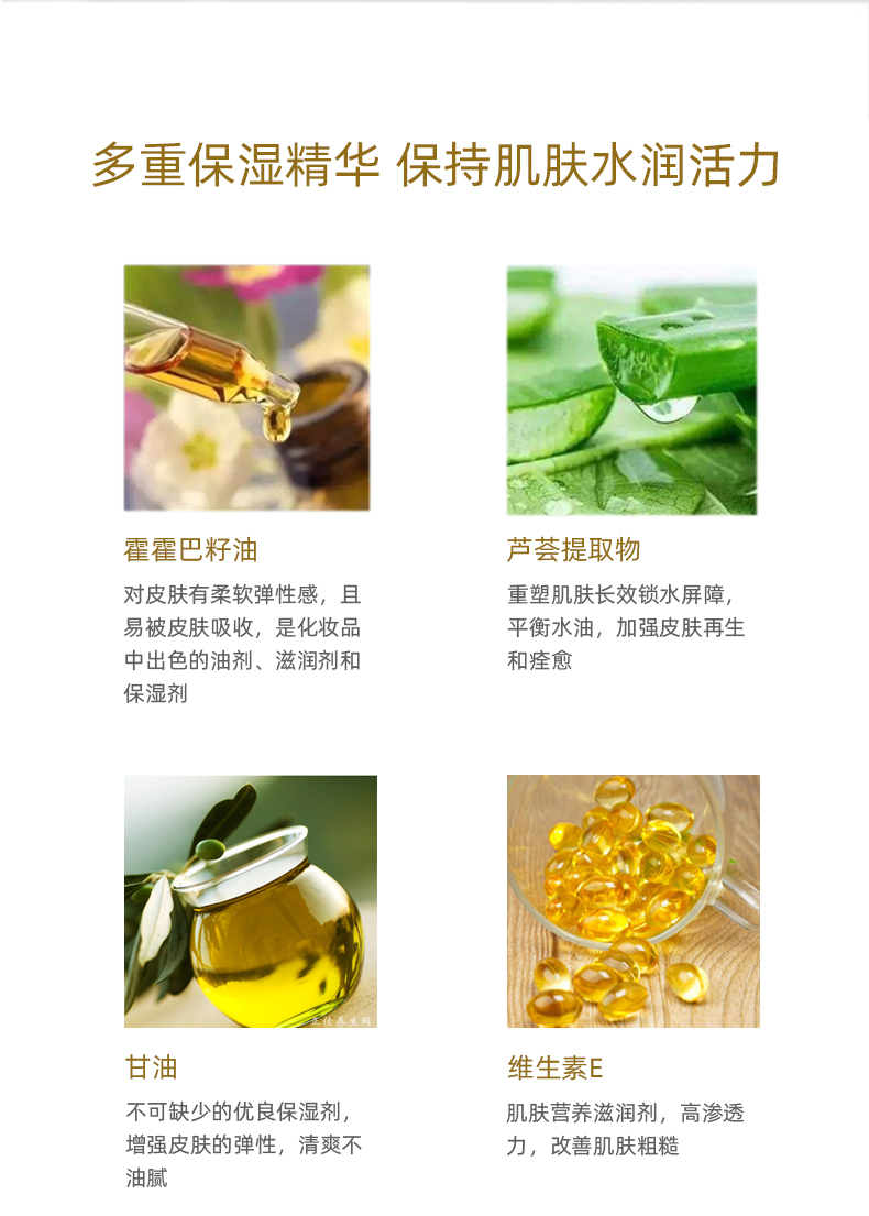 成份:霍霍巴籽油、芦荟提取物、维生素E、甘油等。