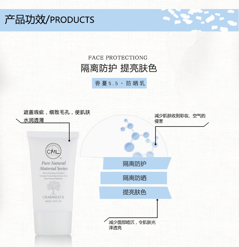 作用:全天抵御外界对肌肤的不同侵害,特别添加橄榄果油、防晒的同时修护肌肤 美白 防晒 遮瑕,提亮肤色 清薄透气,让皮肤自由呼吸,令你夏天无惧骄阳。。