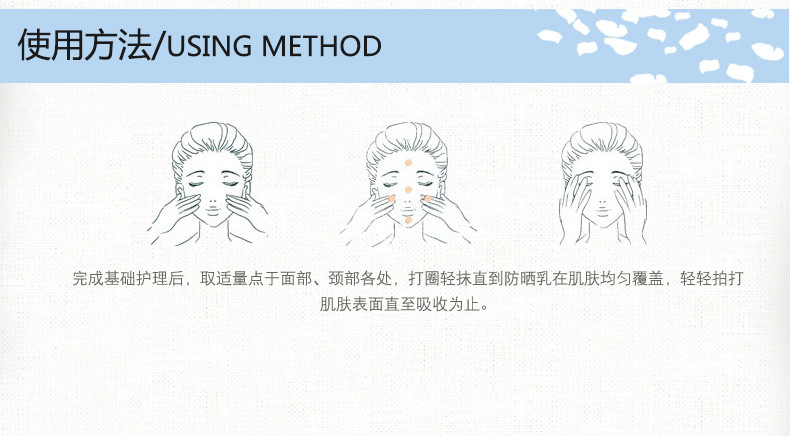 使用方法:每天早上基础保养后,取适量本品顺肌肤纹理涂于面颈部,轻拍至吸收,请于外出前15分钟使用。适合户外活动时使用。