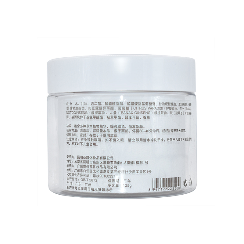 成份:水;甘油;丙二醇;鲸蜡硬脂醇;甘油硬脂酸酯;玉米(ZEA MAYS)淀粉;硅藻土;藻酸钠;珍珠粉;苦参(SOPHORA ANGUSTIFOLIA)根提取物;穿心莲(ANDROGRAPHIS PANICULATA)提取物;掌叶大黄(RHEUM PALMATUM)提取物;黄连(COPTIS CHINENSIS)提取物;甘草(GLYCYRRHIZA URALENSIS)根提取物;透明质酸钠;薄荷(MENTHA ARVENSIS)粉;[双(羟甲基)咪唑烷基脲,碘丙炔醇丁基氨甲酸酯];羟苯甲酯;羟苯丙酯;香精;