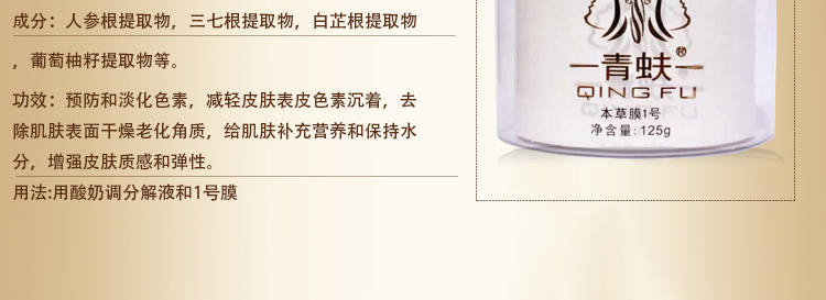 作用:提亮肤色,焕发新颜。预防和淡化色素斑,减轻皮肤表皮色素沉着,祛除肌肤表面干燥老化角质,给肌肤补充营养和保持水分,增强皮肤质感和弹性。对黄褐斑,胡蝶班,反弹班,日晒班,散班有明显效果。