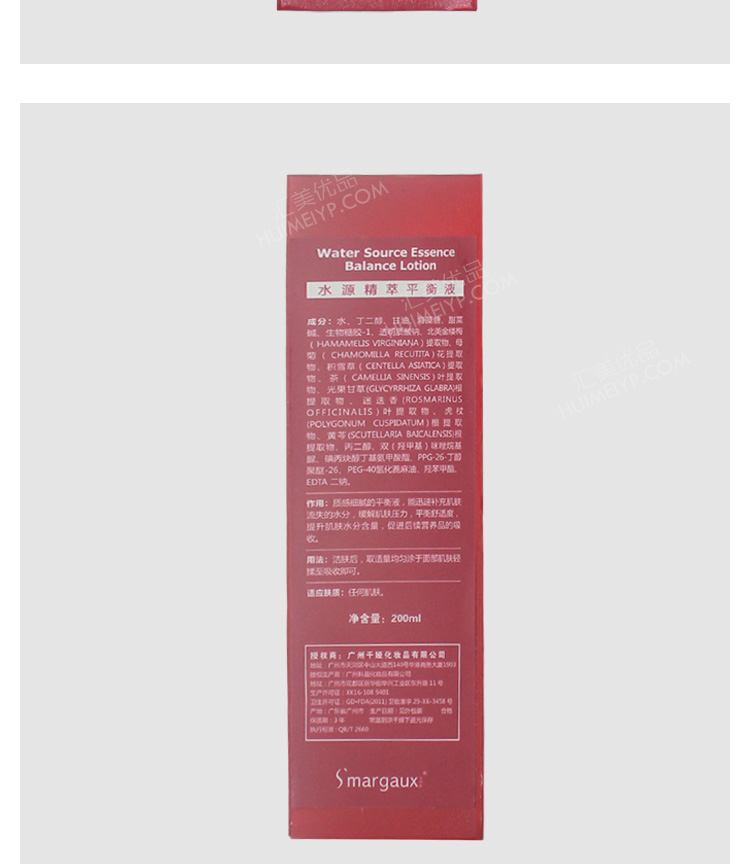 成份:水、丁二醇、甘油、海藻糖、甜菜碱、生物糖胶-1、透明质酸钠、北美金缕梅提取物、母菊花提取物、积雪草提取物、茶叶提取物、甘草根提取物、迷迭香提取物、虎杖根提取物等。