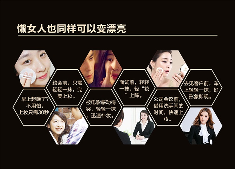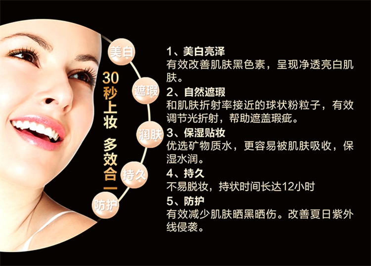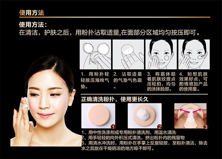 使用方法:在清洁,护肤之后,用粉扑沾取适量,在面部分区域均匀按压即可。