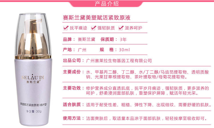 使用方法:洁面爽肤后,取适量本品涂于面部肌肤,轻轻按摩至吸收即可。