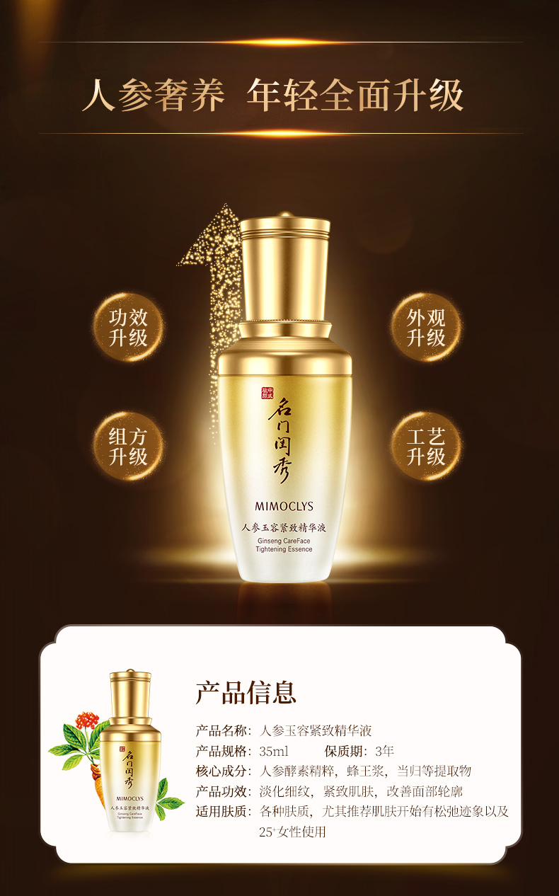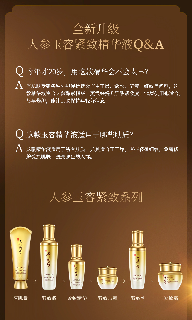适合肤质:任何肤质,尤其25+以上女性及皱纹、松弛等轻熟龄肌肤。