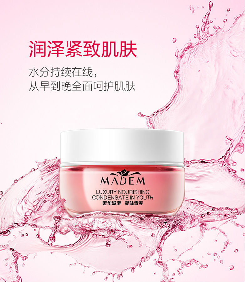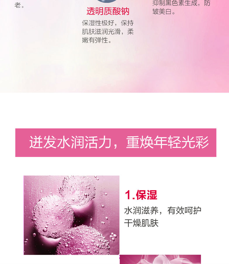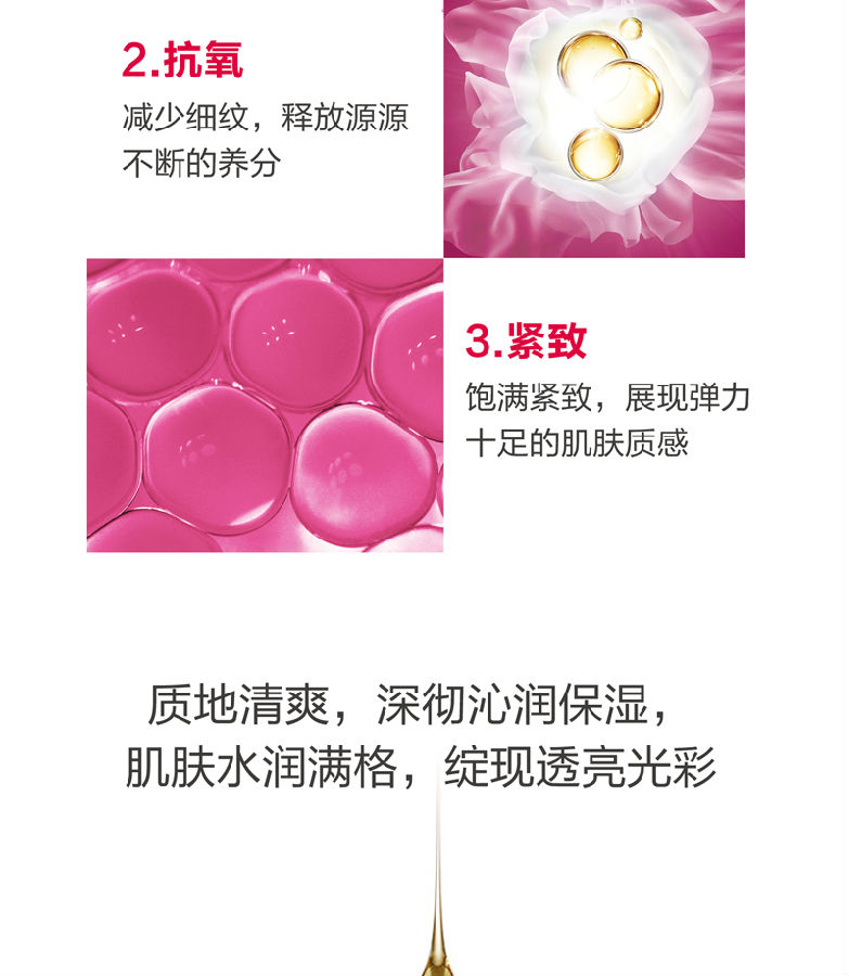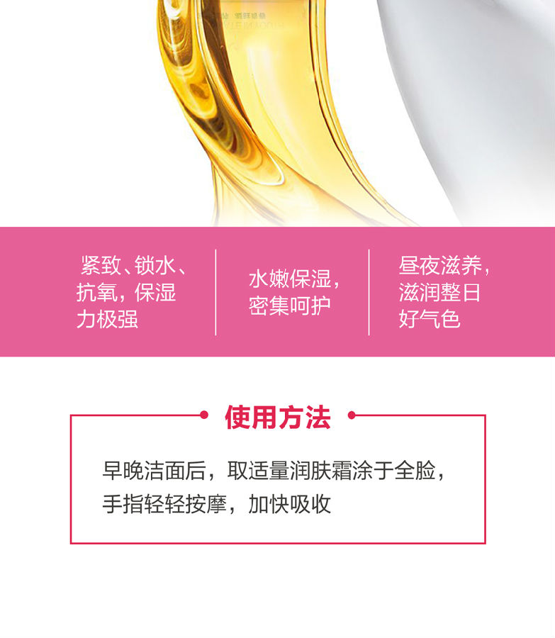 作用:蕴含丰沛滋养精华,源源释放养分; 减少细纹,有效呵护干燥肌肤; 饱满紧致,展现弹力十足的肌肤质感。