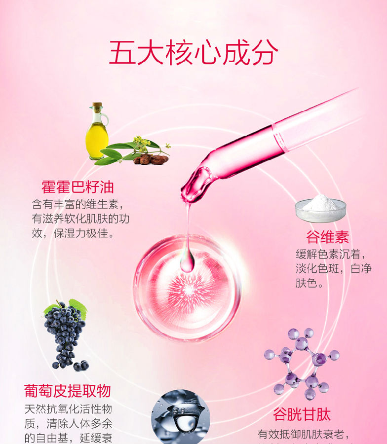 成份:霍霍巴籽油、葡萄皮提取物、谷胱甘肽、谷维素、透明质酸钠