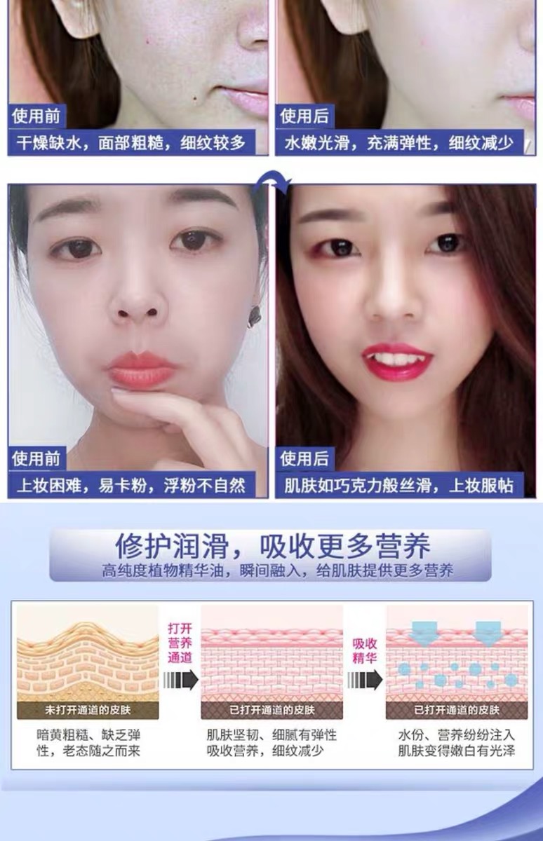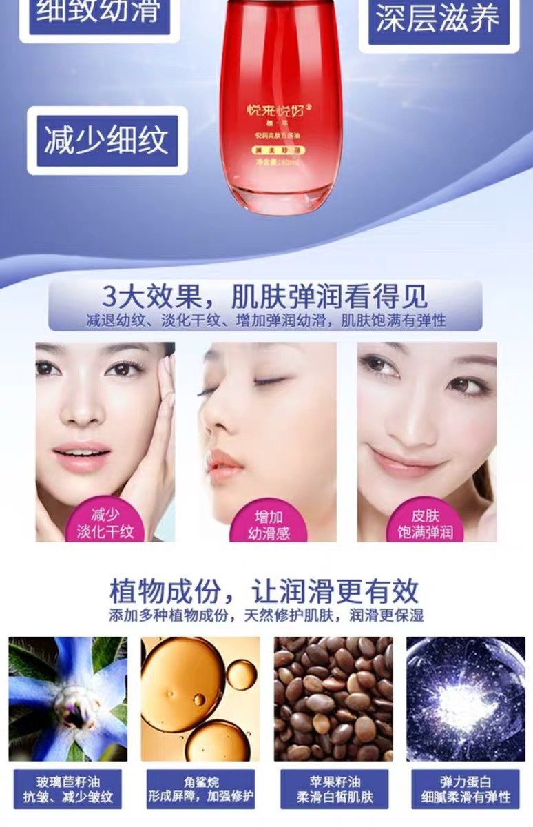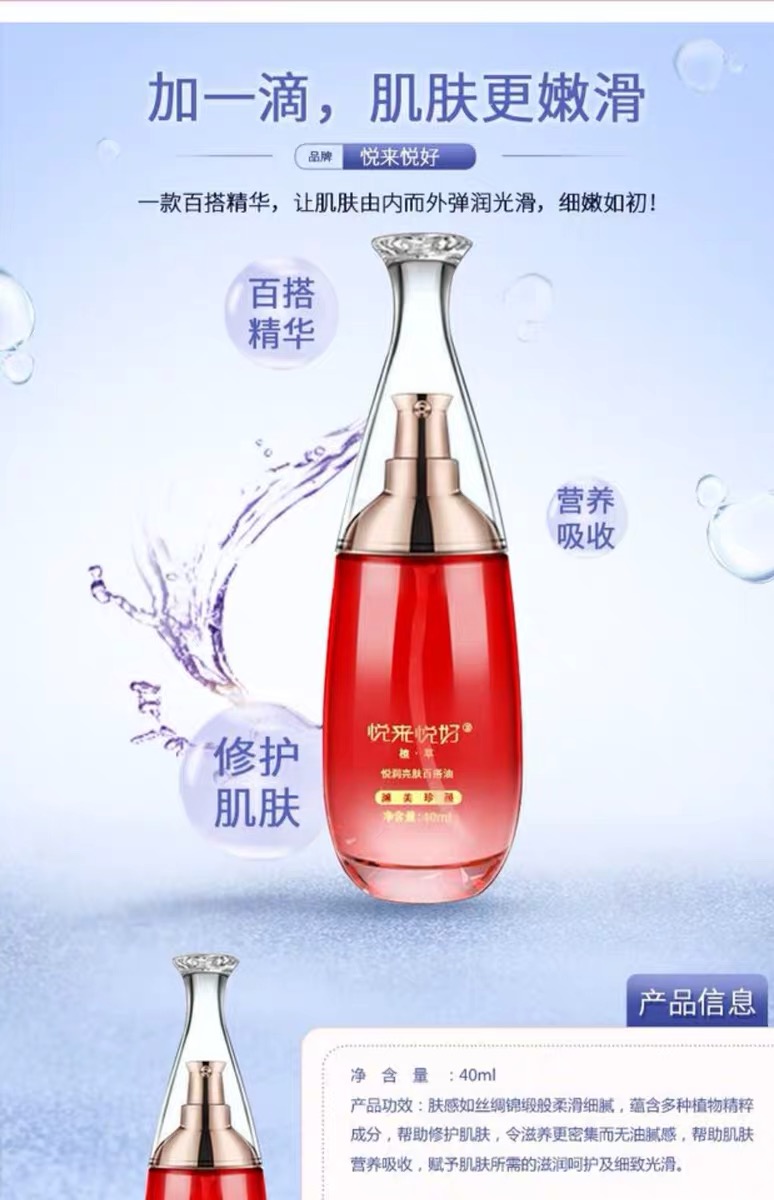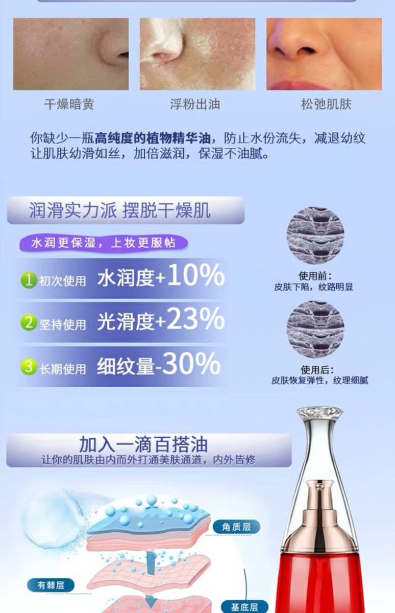 使用方法:使用精纯蜜、乳液、乳霜等时,取所用产品置于掌心,再滴百搭油1-2滴,糅合均匀后涂抹面部及颈部肌肤至吸收,也可直接用于眼、面、颈部肌肤的按摩。