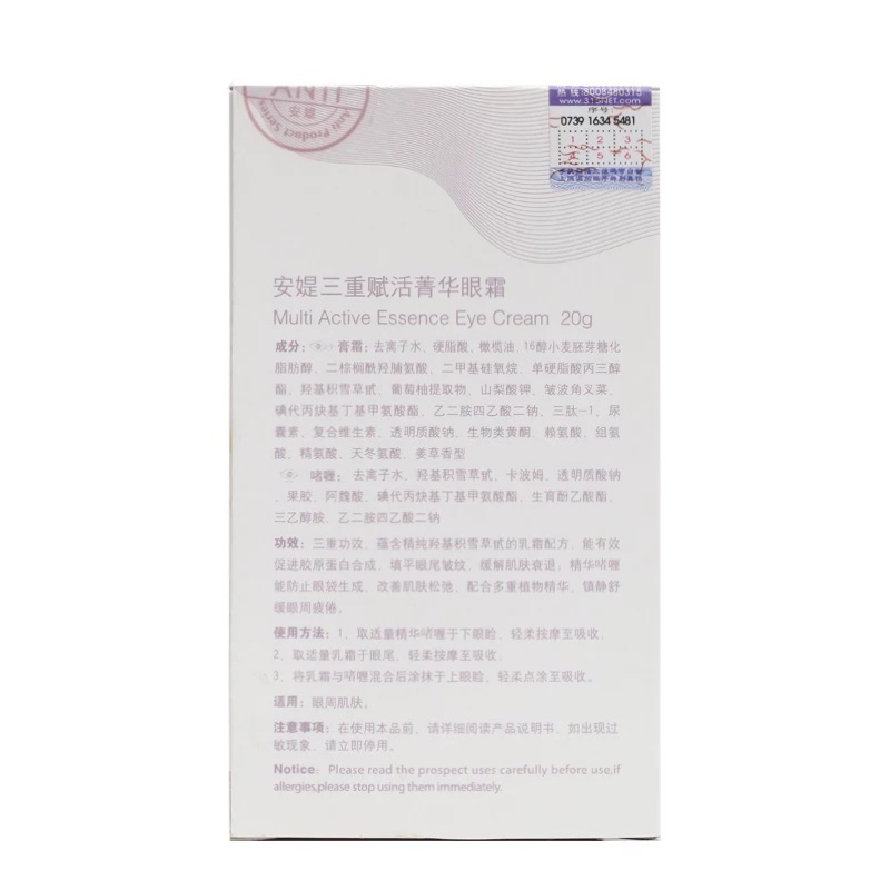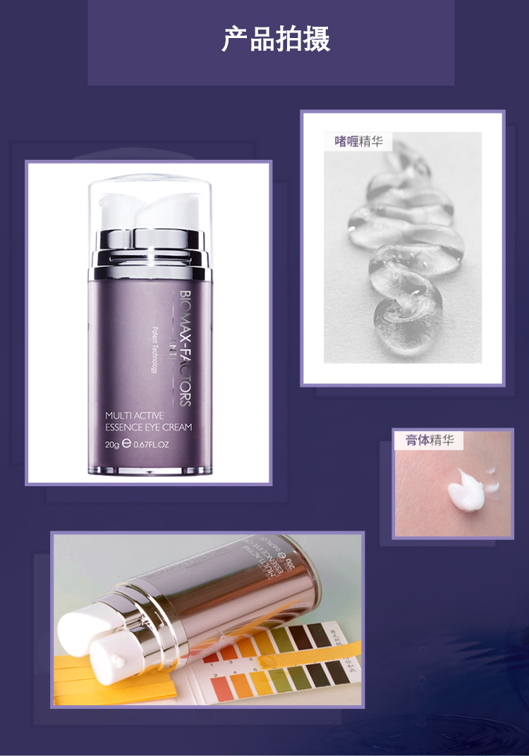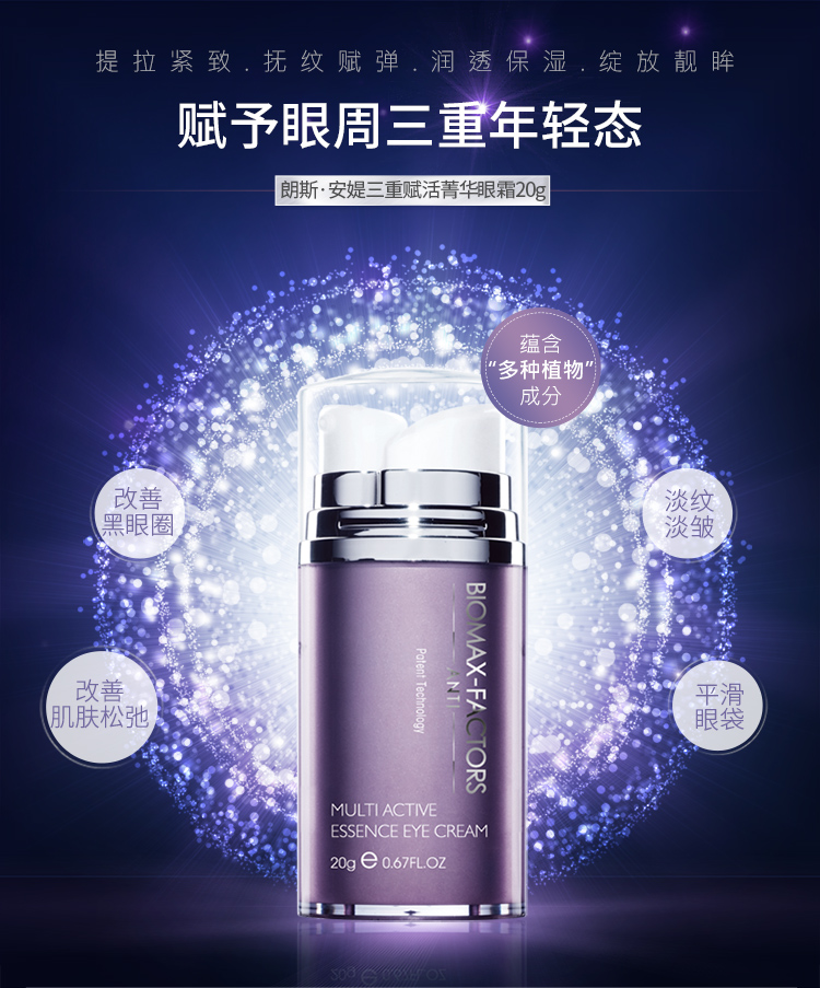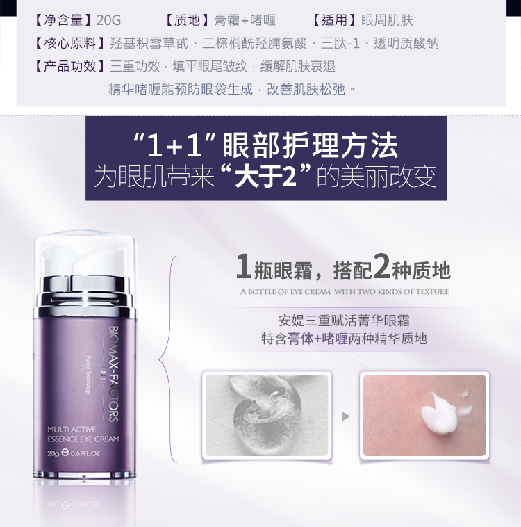 作用:三重功效,蕴含精纯羟基积雪草甙的乳霜配方,能有效促进胶原蛋白合成,填平眼尾皱纹,缓解肌肤衰退;生物糖胶能防止眼袋生成,改善肌肤松弛,配合多重植物精华,镇静舒缓眼周疲倦。