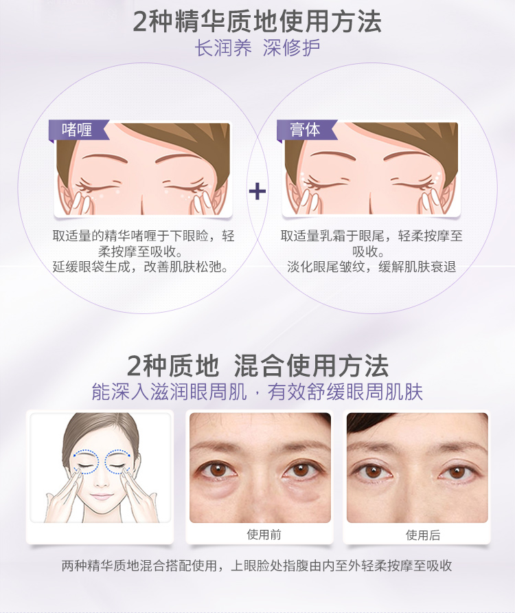使用方法:1、取适量精华啫喱于下眼睑,轻柔按摩至吸收;2、取适量乳霜于眼尾,轻柔按摩至吸收;3、将乳霜与啫喱混合后涂抹于上眼睑,轻柔点涂至吸收