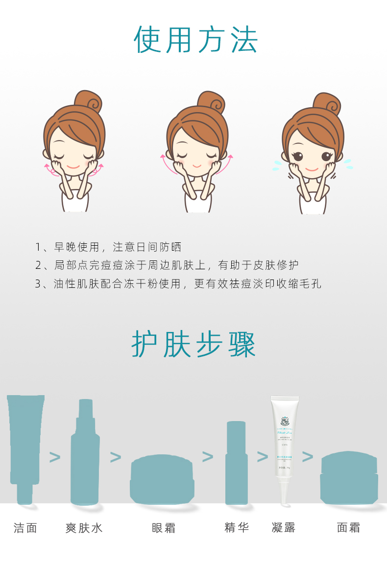 使用方法:1、早晚使用,注意日间防晒2、局部点涂痘痘及周边肌肤,有助于皮肤修护3、油性肌肤配合冻干粉使用,更有效祛痘淡化痘印收缩毛孔。