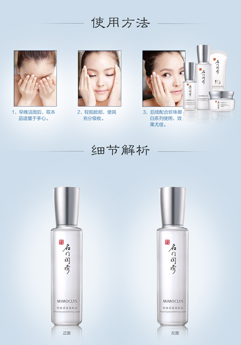 使用方法:洁面后,取适量轻拍面部吸收即可