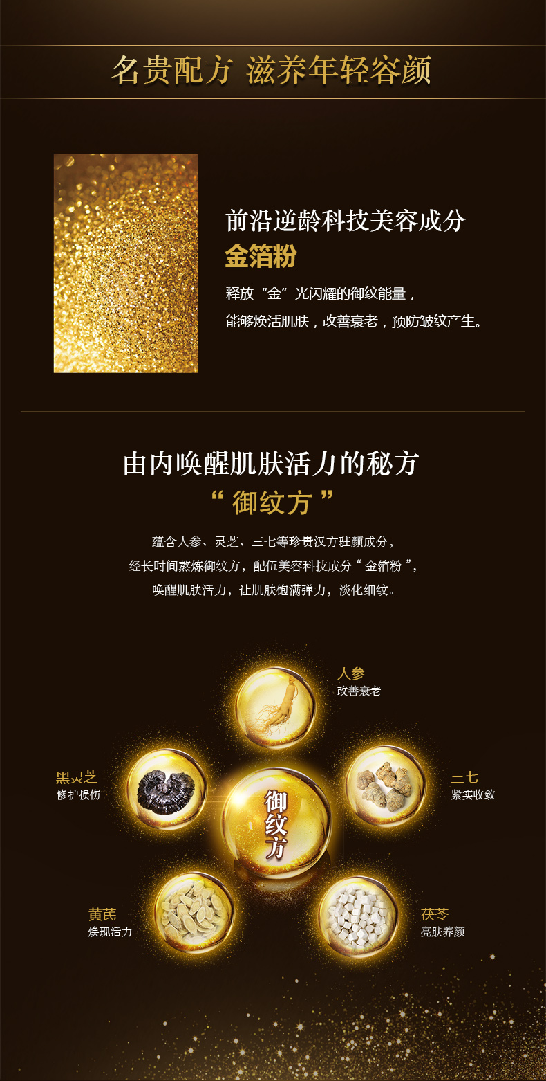成份:金箔粉、黑灵芝、人参、黄芪、茯苓、三七等