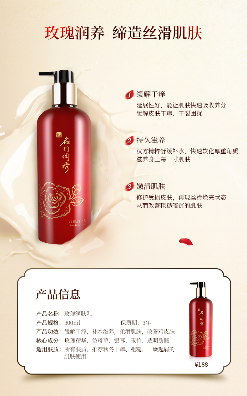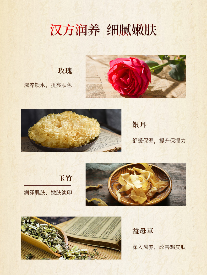 成份:金边玫瑰精华、银耳、益母草、石斛、玉竹提取物,等。