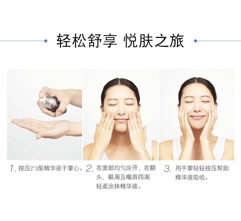 使用方法:化妆水爽肤后,取适量2-3泵于掌心,均匀涂抹于整个面部直至吸收。