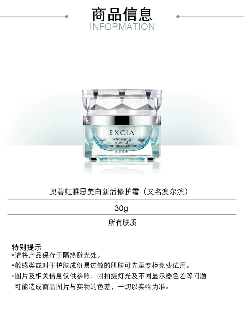 特别说明:●伤口、肿块、过敏、色素异常等异常部位请勿使用。●化妆品对肌肤造成下述不适情况时,请停止使用。①使用时出现发红、发肿、发痒、刺激等异常现象。②使用后在皮肤遇到阳光直射时出现以上异常现象。●如不慎进入眼睛,请立即用清水清洗。