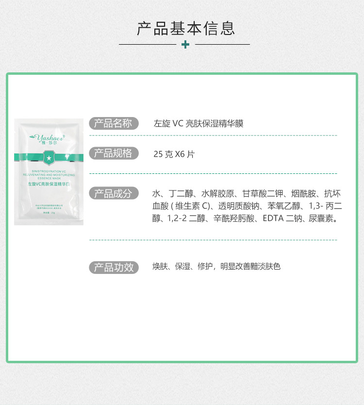雅莎尔(yashaer)左旋VC亮肤保湿精华膜25g*6片