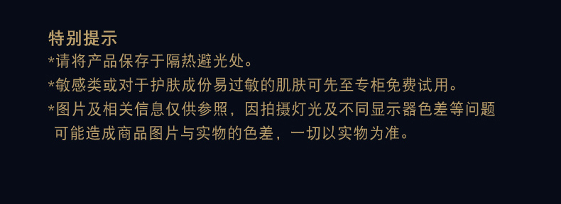 特别说明:●伤口、肿块、过敏、色素异常等异常部位请勿使用。●化妆品对肌肤造成下述不适情况时,请停止使用。①使用时出现发红、发肿、发痒、刺激等异常现象。②使用后在皮肤遇到阳光直射时出现以上异常现象。●如不慎进入眼睛,请立即用清水清洗。