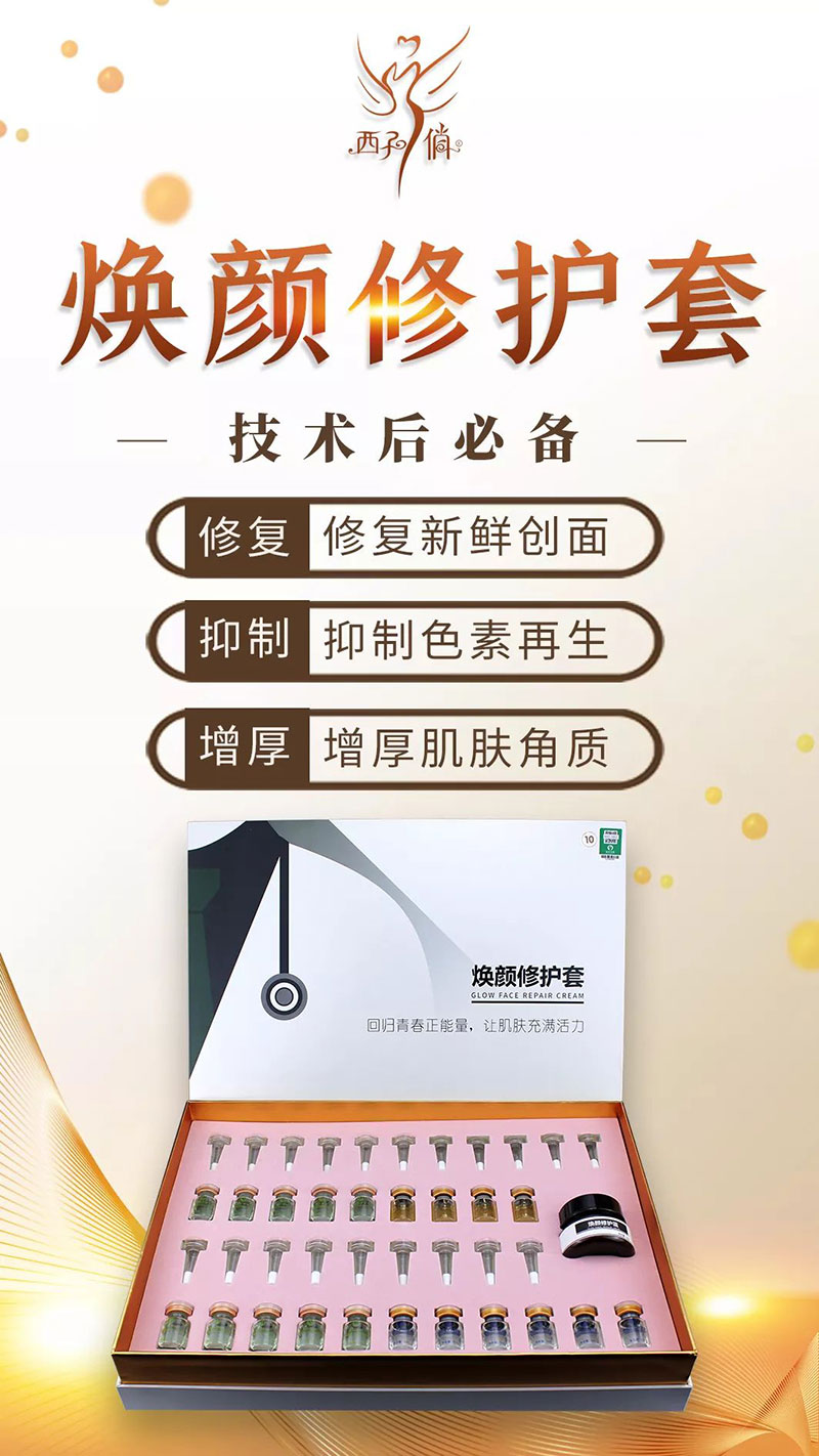 商品规格:1、焕颜修护原液5ml*4支 2、焕颜修护精华液5ml*4支 3、再升原液5ml*10支 4、焕颜修护霜50g 5、喇叭头 20个