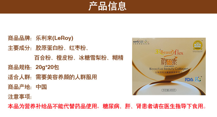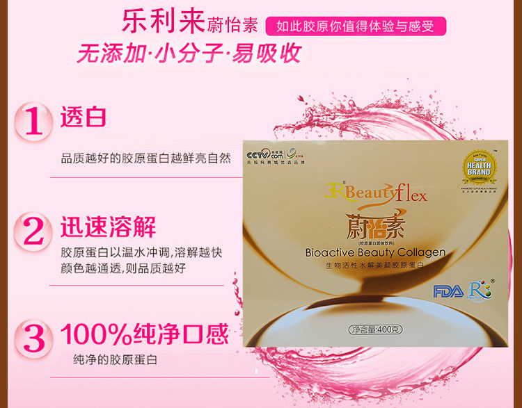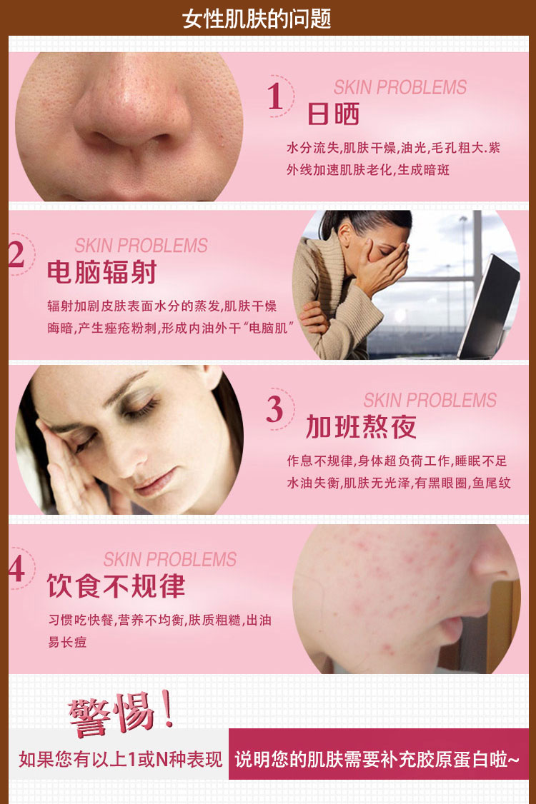 产品功效:给肌肤补充胶原蛋白,头发和指甲的质量,帮助女性由内向外散发美丽光彩,恢复及均衡肌肤的水分,改善肌肤的滋润度,提高皮肤弹性及表层拉力,抚平及减少皱纹,预防皱纹以及延缓真皮层的老化等到