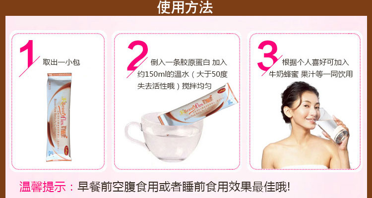 使用方法:300毫升温水加入本品,搅拌均匀即可饮用。可根据个人喜好,添加牛奶、果汁、蜂蜜等调配自己喜欢的口味饮用。