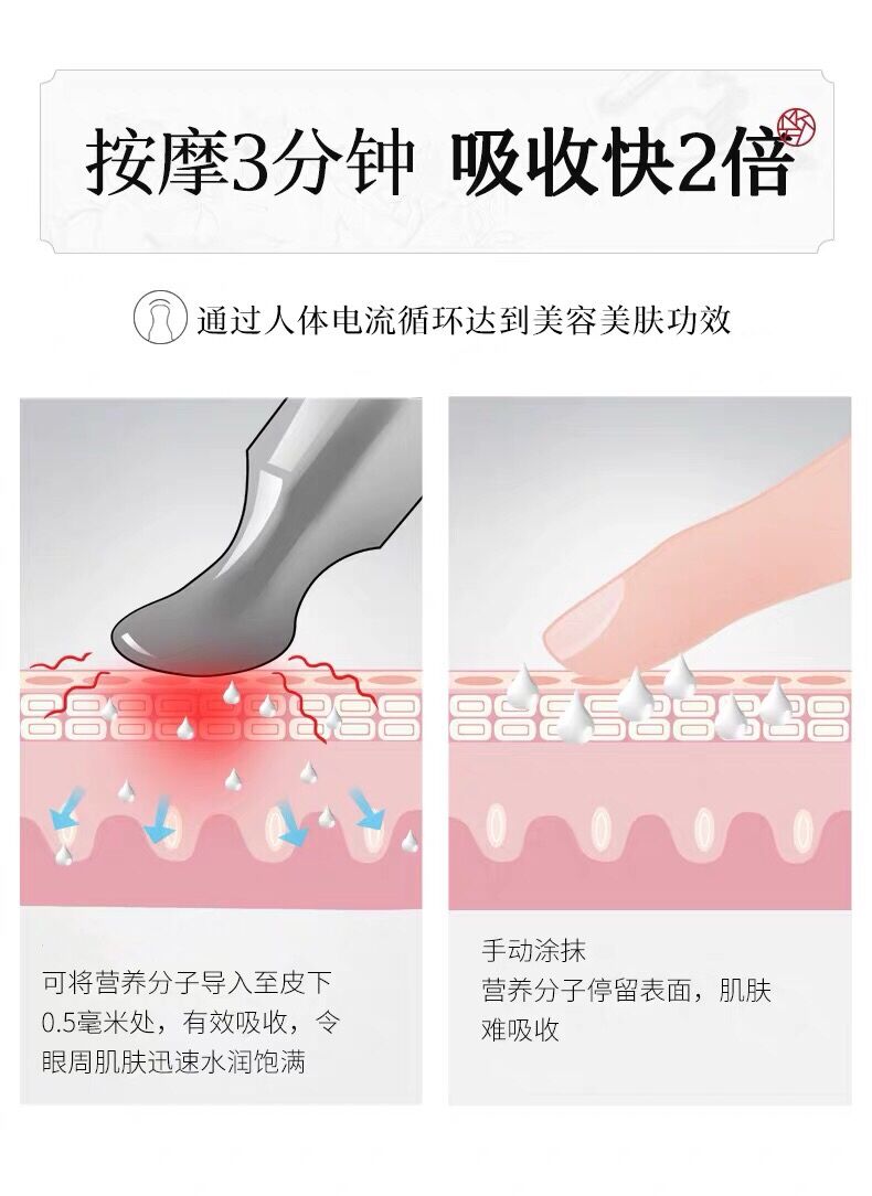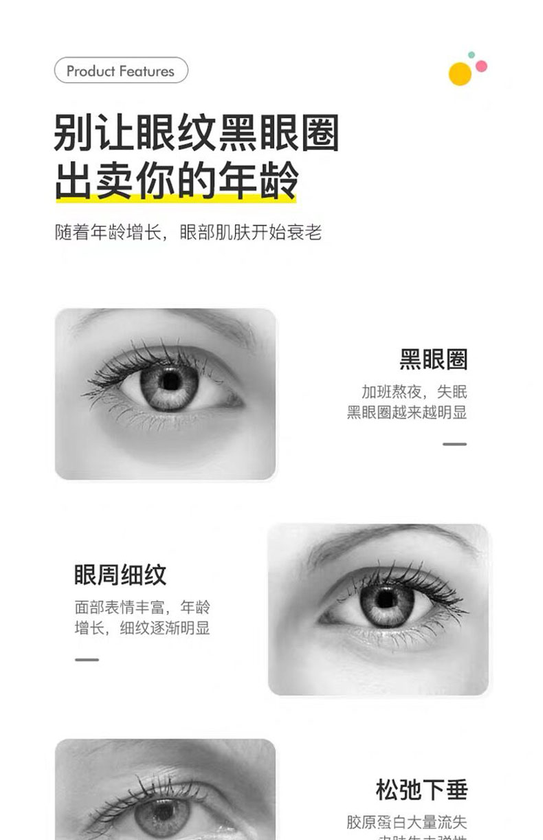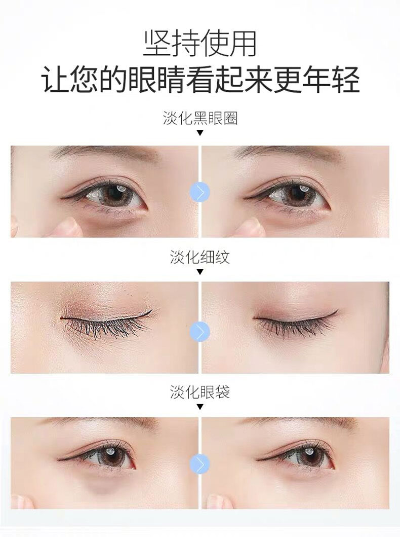 使用方法:洁肤爽肤后,取适量本品均匀涂抹于眼周肌肤,涂抹按摩至完全吸收即可。