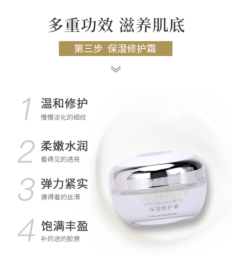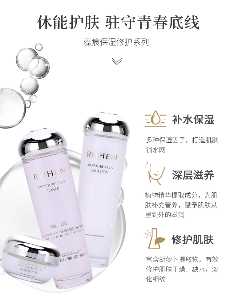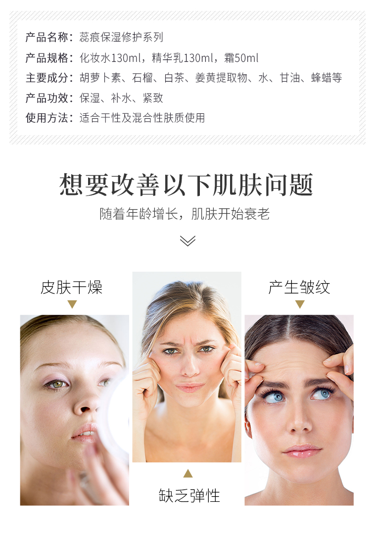 商品规格:1. 蕊痕保湿修护化妆水130ml 2. 蕊痕保湿修护精华乳130ML 3.蕊痕保湿修护霜50ml