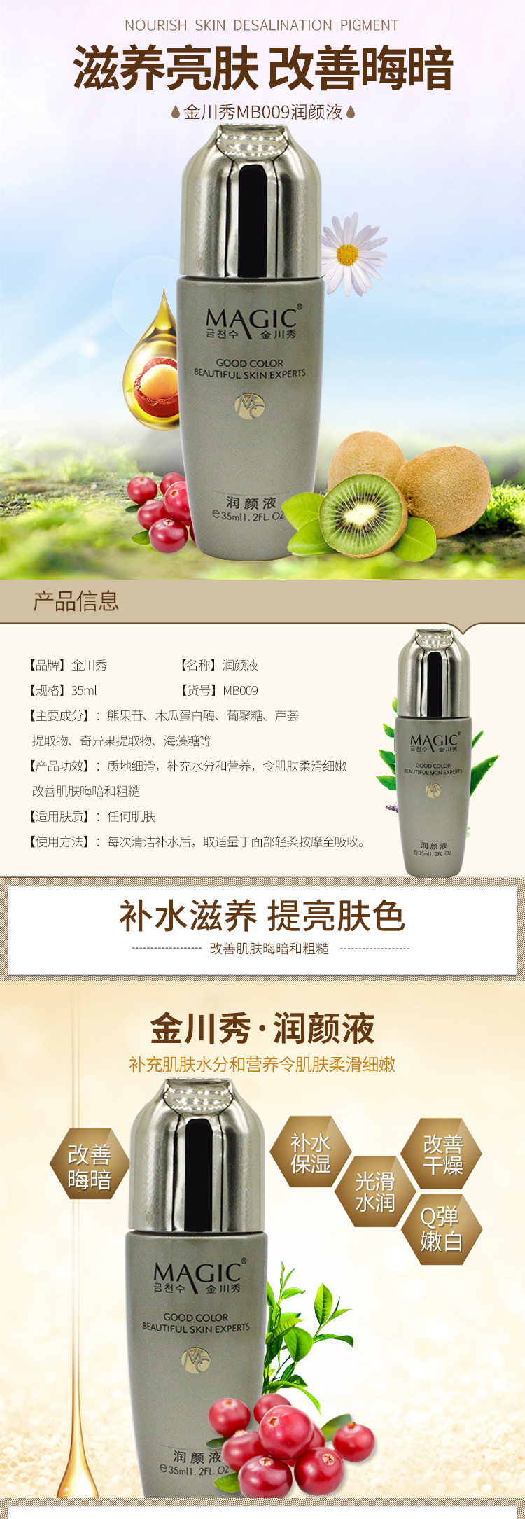 作用:强力渗透肌肤,激活细胞,促进新陈代谢,有效抑制自由基,迅速补充水份及胶原养份,延缓老化,增强弹性和张力,并能淡化黑色素,美白肌肤,令肌肤润滑、嫩白、光泽。质地细滑、补充肌肤水分和营养,令肌肤柔滑细嫩,改善肌肤晦暗和粗糙。