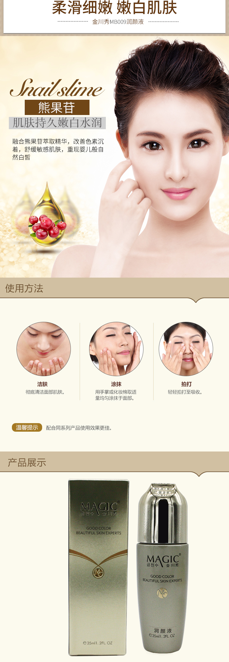 使用方法:每次清洁补水后,取适量于面部轻柔按摩至吸收。