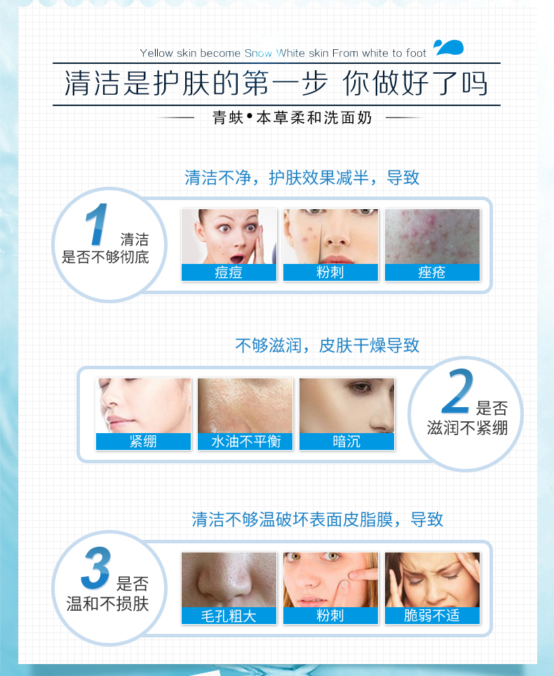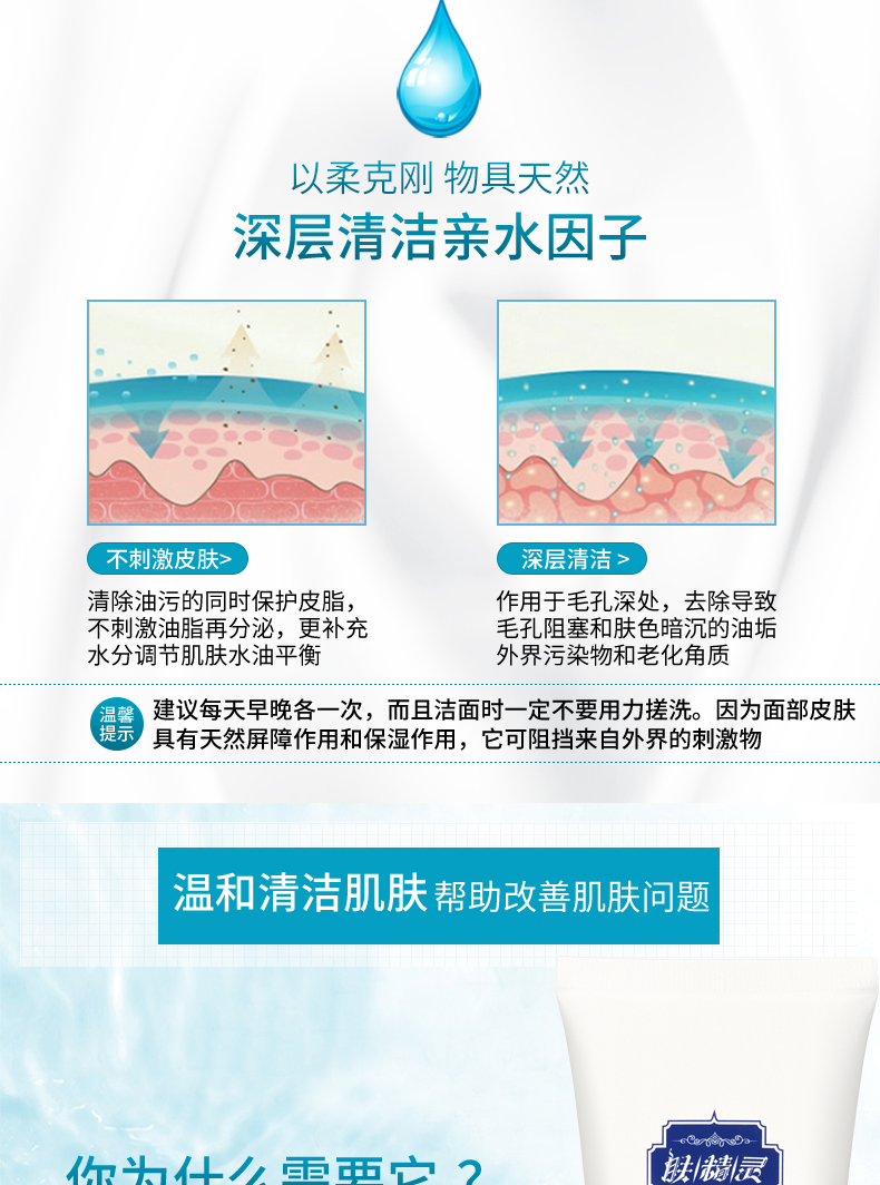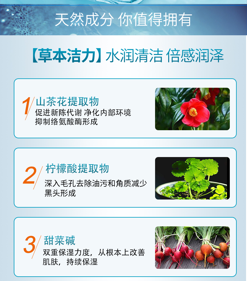 作用:氨基酸体系,泡沫丰富细腻,能轻柔洗去皮肤表面污垢、残妆,多余油脂及老化角质,肌肤感受清新舒适。