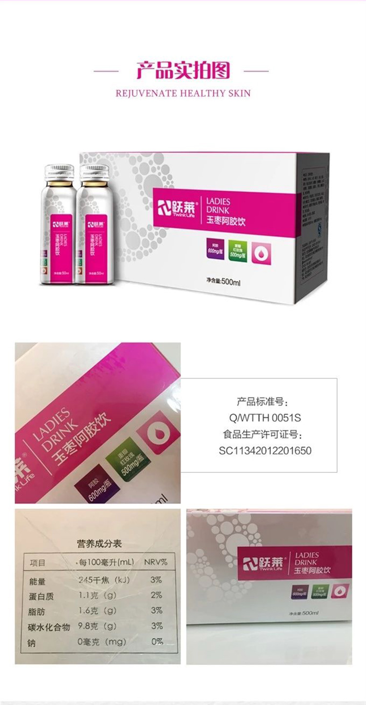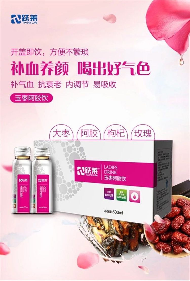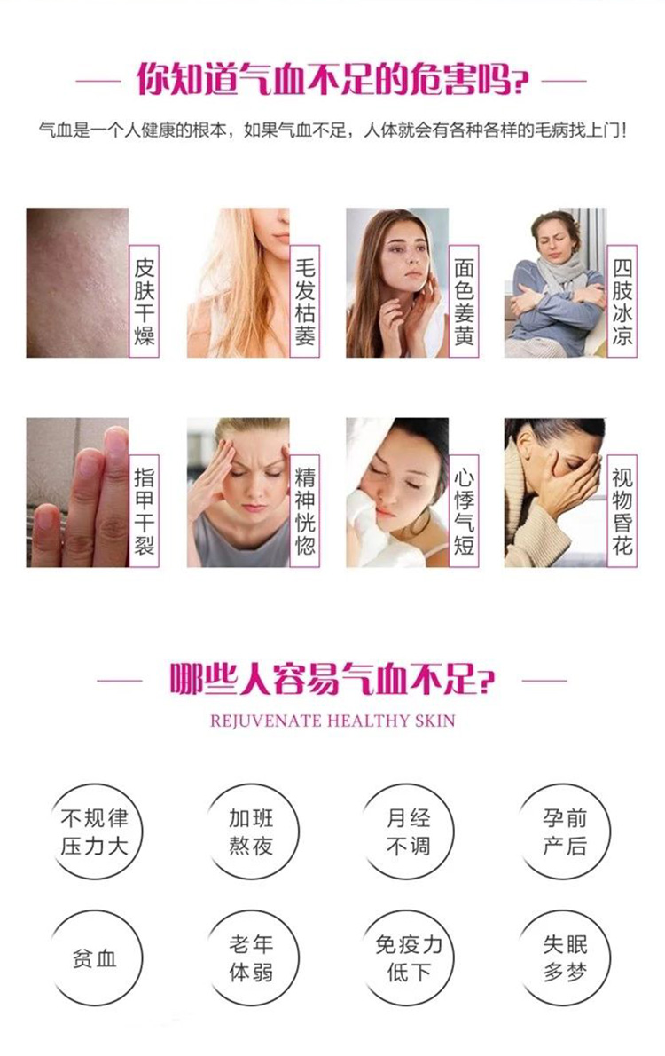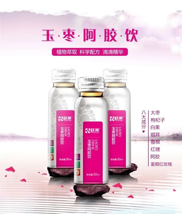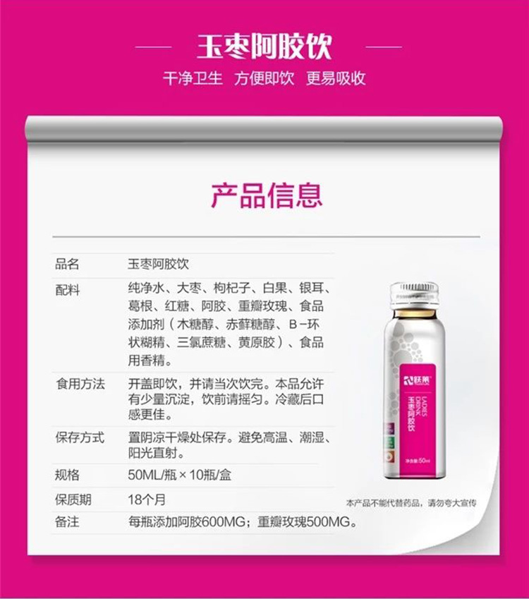 营养成分:和田玉枣、阿胶、葛根提取物、枸杞、白果、重瓣红玫瑰、银耳、红糖。