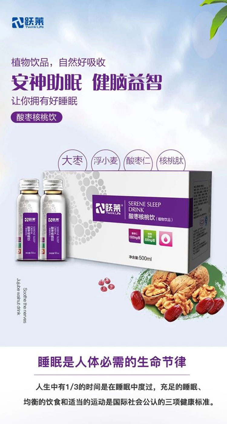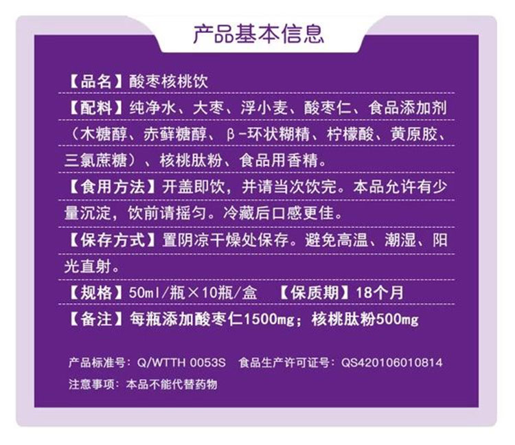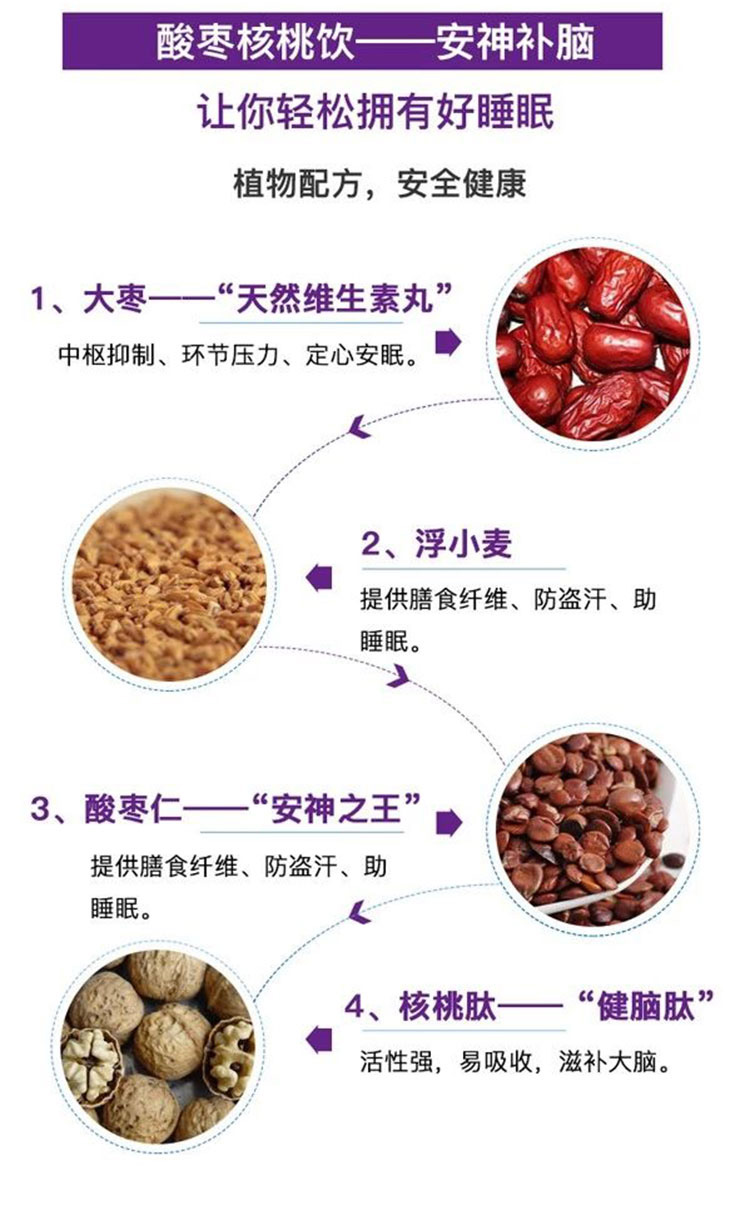 营养成分:核桃肽、酸枣仁、大枣、浮小麦。