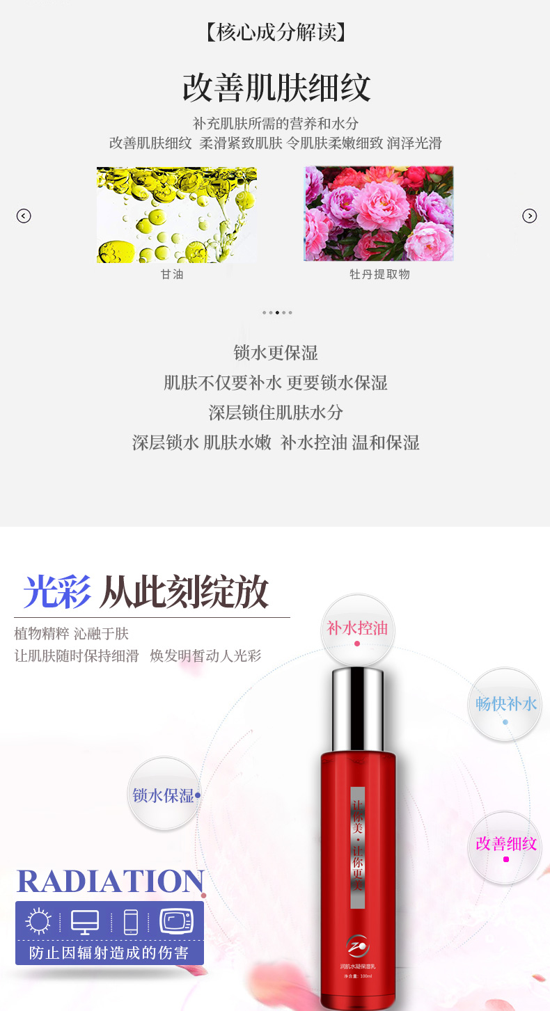 作用:补水肌肤所需的营养和水分,改善肌肤细纹,柔滑紧致肌肤,令肌肤柔嫩细致,润泽光滑