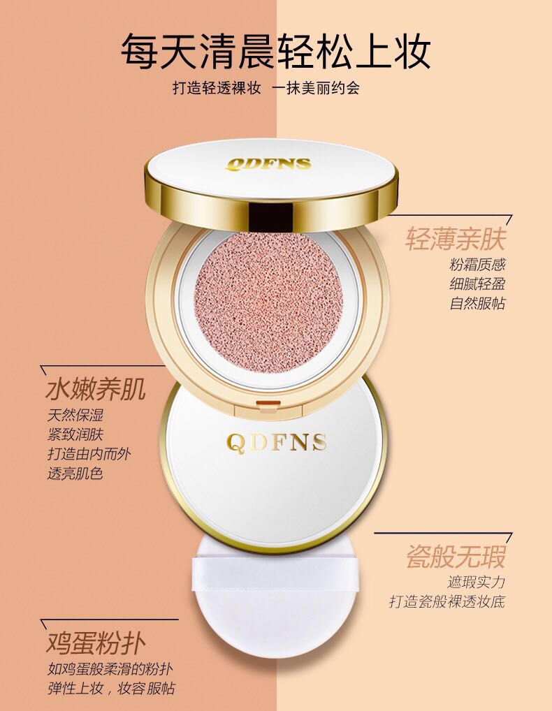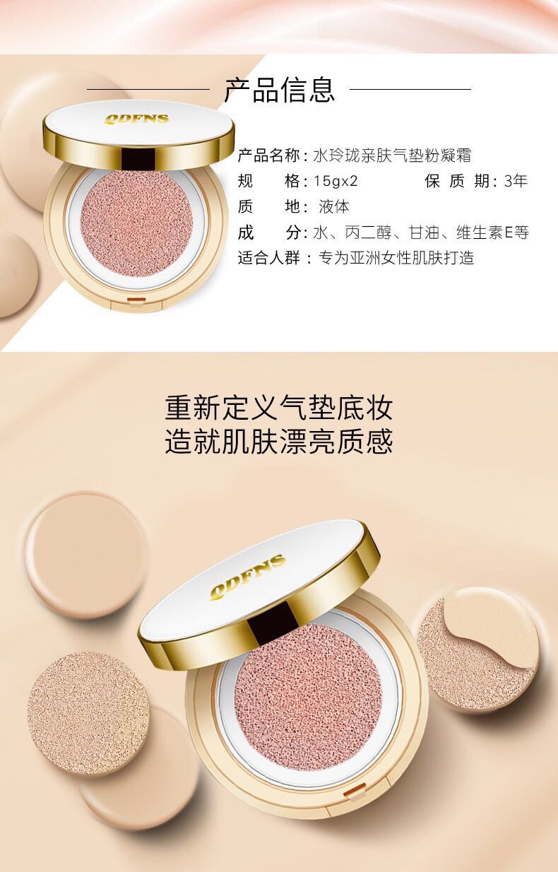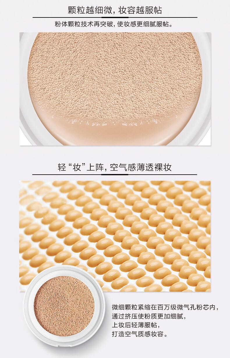使用方法:用粉扑按压海绵气垫取适量内容物,沿肌肤纹理涂抹或均匀按压贴服肌肤,如需加强遮盖保湿力,可重复涂抹按压一次。