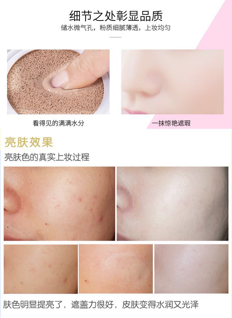 作用:便于携带,方便使用,内置小镜子贴心设计,纳米抗菌海绵氧气垫,800000个密集气孔,新鲜保存每一个有效成分,富含活性水分子,长久保湿亮泽,萃取天然植物降温因子,双重隔离炎热,与肌肤完mei贴合,集补水,隔离,修复,遮暇,亮白,舒缓,修颜,控油,持久,淡化细纹,紧致毛孔于一体,全天候展现水亮般玲珑剔透亮白润泽的无暇美肌。