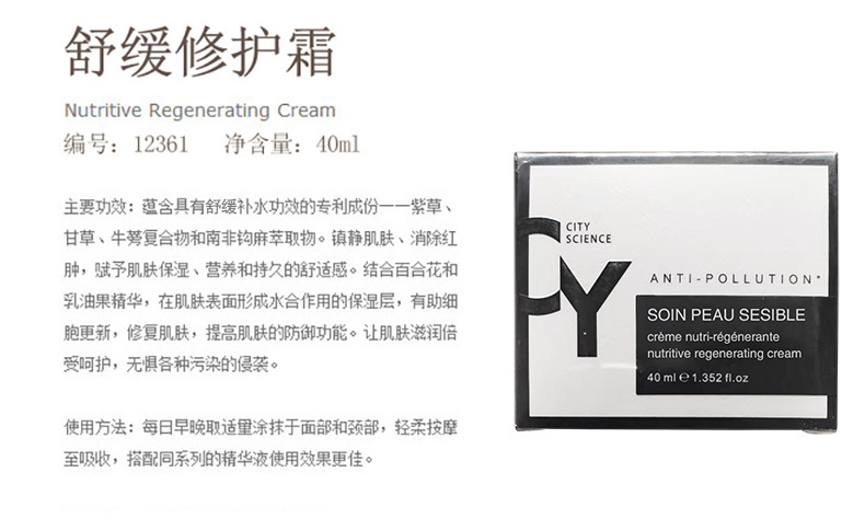 作用:本品丰富的植物精华成分能赋予肌肤营养和持久的舒适感,修复受损的肌肤,增强肌肤抵抗力,缓解肌肤因污染等造成的过敏症状。