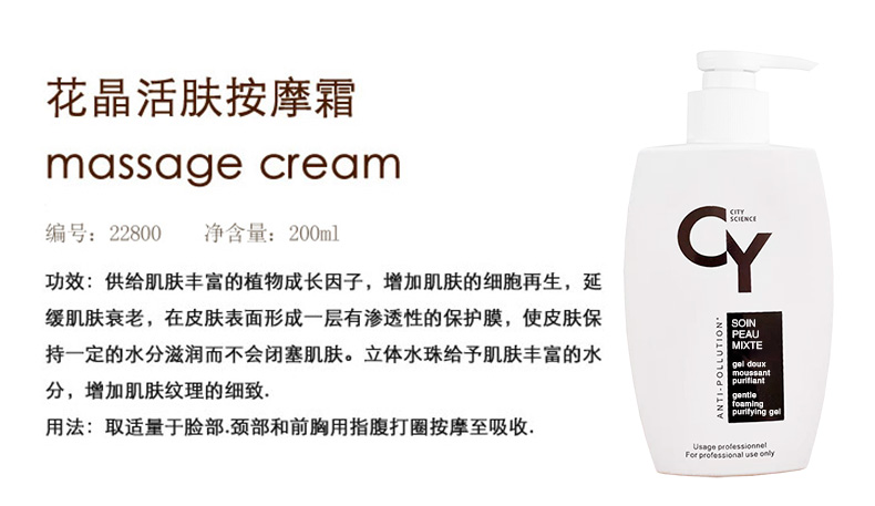 使用方法:取适量于脸部、颈部和前胸打圈按摩,再彻底清洁干净。注意事项:第一次使用时请拧开旋盖,撕掉管孔贴膜,并重新旋紧管盖后再使用。